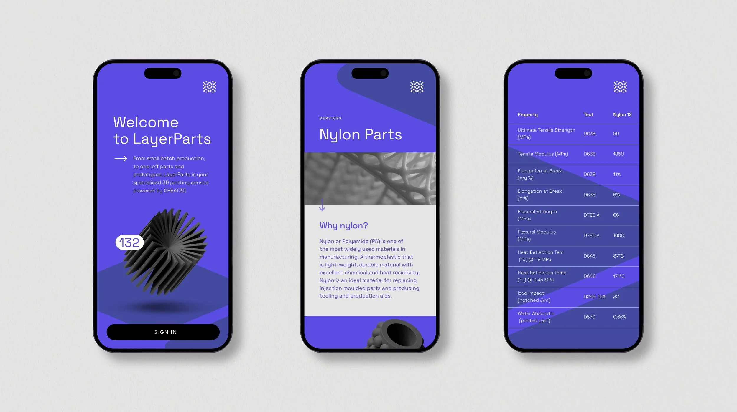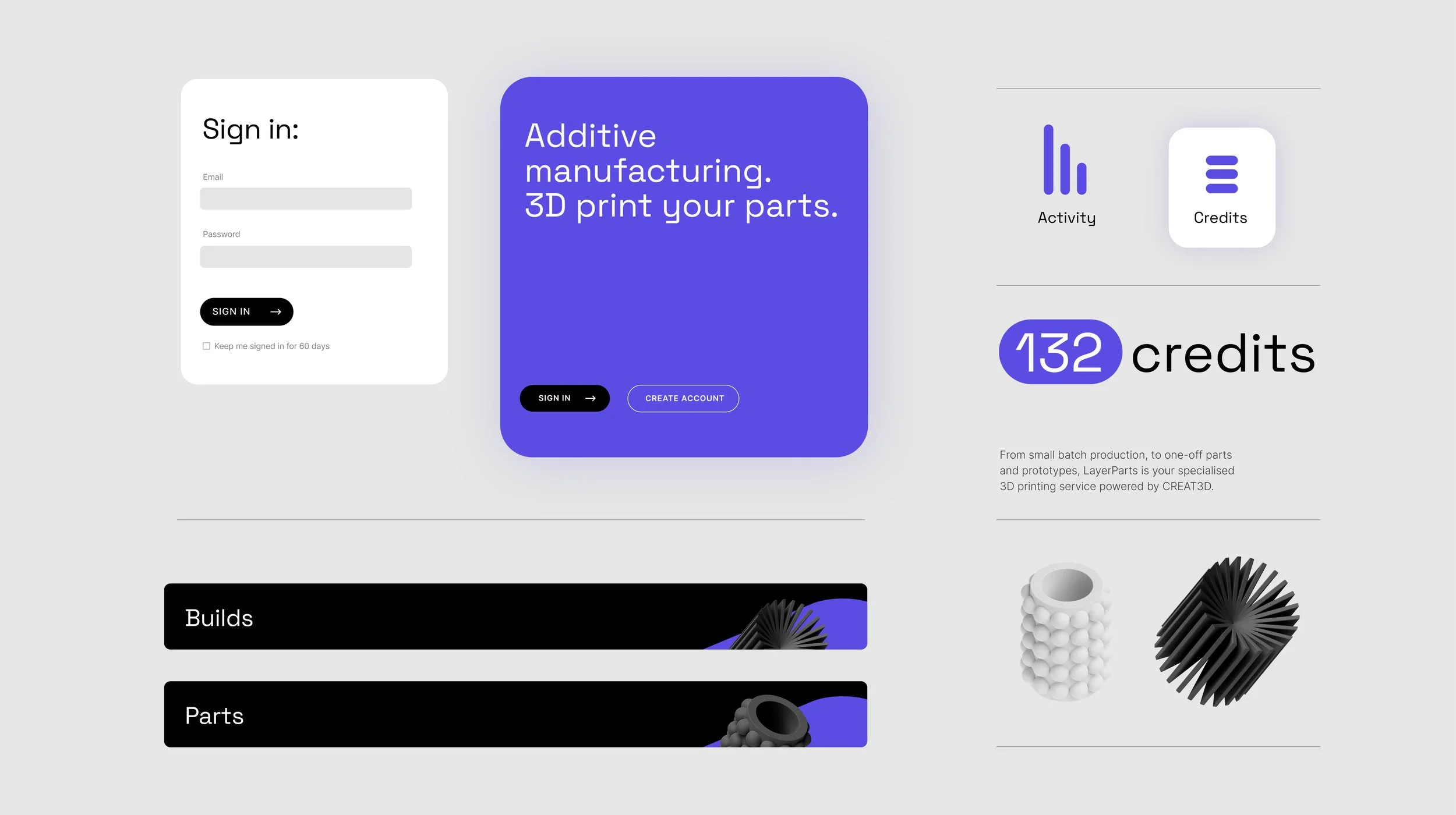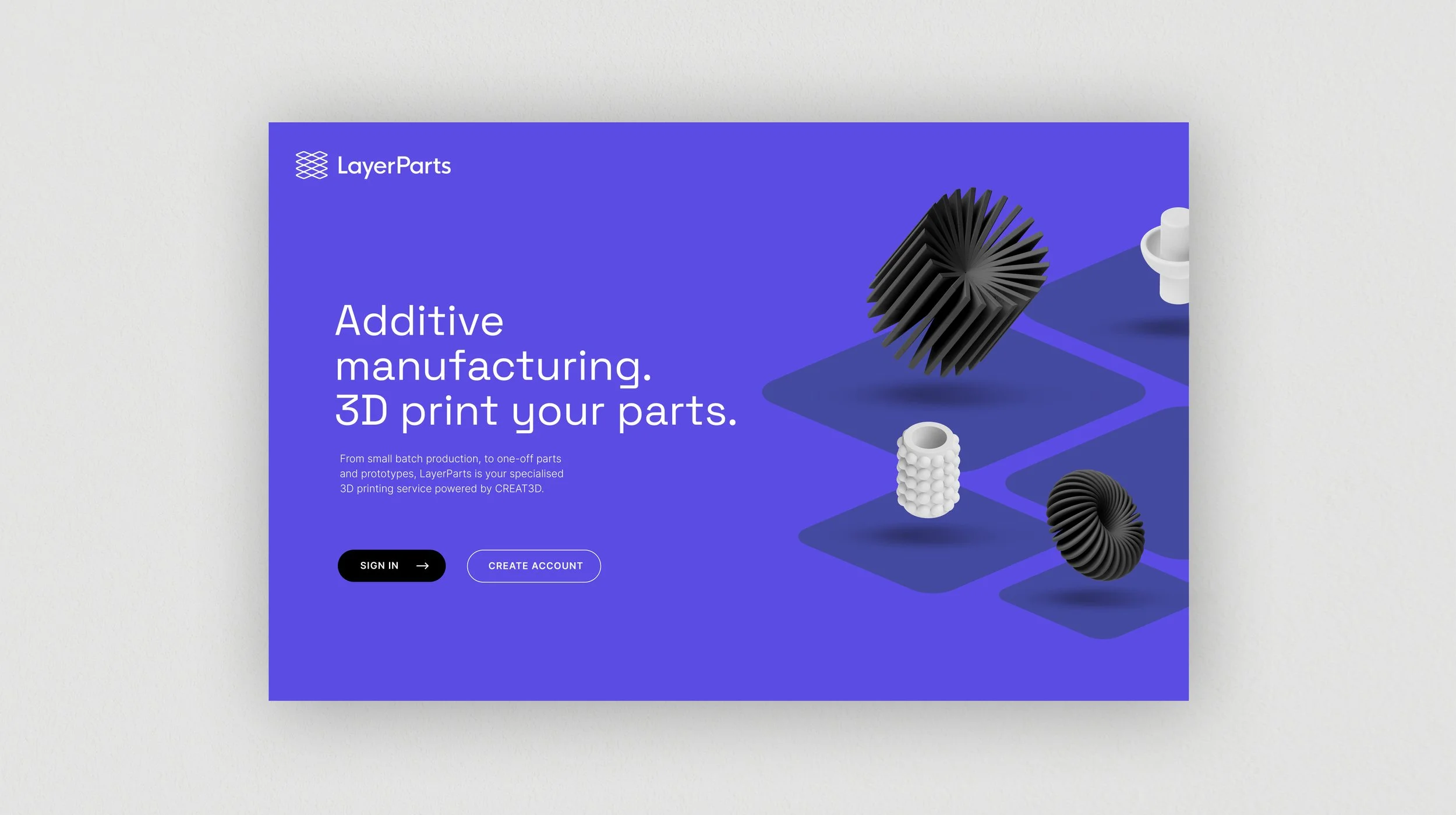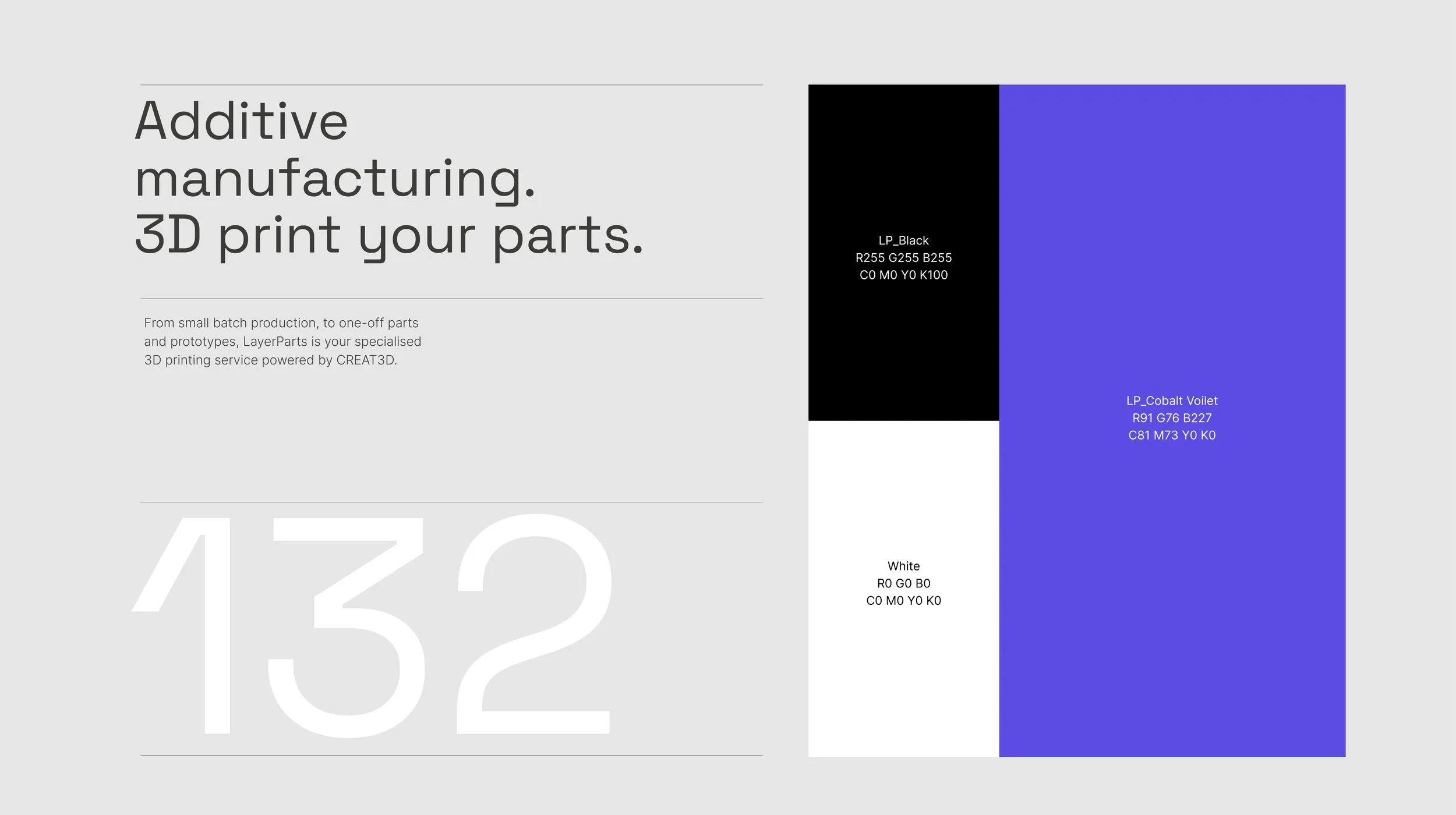 LayerParts is a specialised 3D printing service offering small batch production to one-off parts and prototyping. Keeping operations small makes manufacturing easier and saves time through instant quotes and a flexible scheduling service. A new graphic language was created with a minimal colour palette and strong 3D iconography, giving LayerParts real stand-out within the industry.